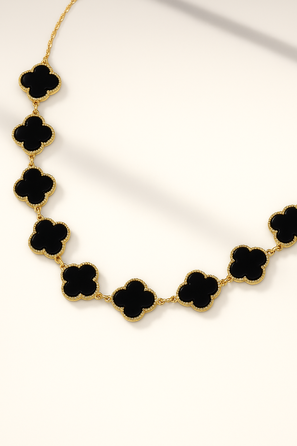 Inspired by timeless motifs, the Arabesque Necklace showcases a graceful quatrefoil design framed in golden detail. Available in rich shades of green, classic black, and luminous ivory, it’s a statement of elegance that transitions seamlessly from everyday sophistication to evening glamour.