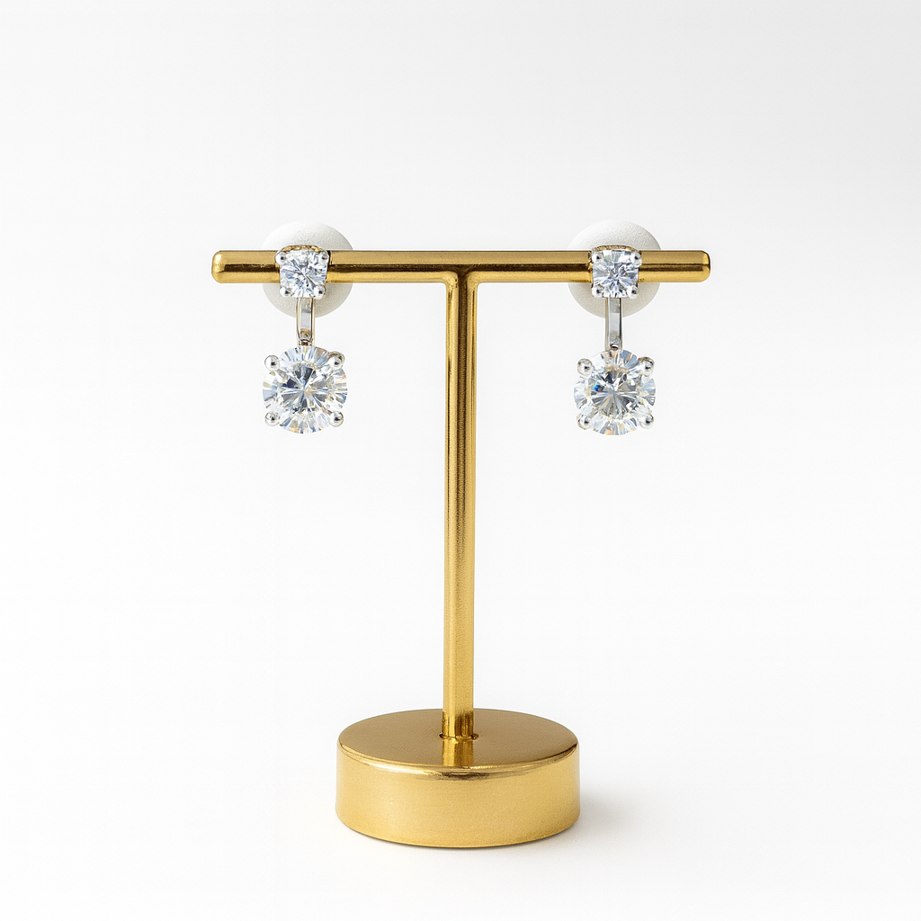 The Aurelia Drops illuminate the Lumera Collection with a refined brilliance that feels both modern and effortlessly feminine. Each earring features an 8.0mm, 2.0ct D color moissanite that captures light with remarkable clarity, suspended from a petite solitaire for a graceful sense of movement. Set in sterling silver with rhodium plating, the design offers a clean, luminous finish that enhances the fire of every stone. GRA certification ensures trusted quality and the elevated craftsmanship that defines MK Atelier.