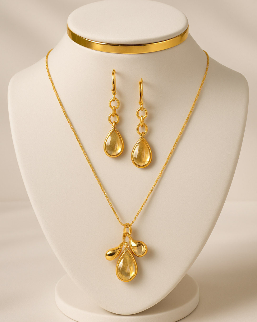 The Aurion Set by Herreira captures the natural beauty of light through fluid drop-shaped forms plated in radiant 18k gold. The pendant and earrings mirror each other with elegant curves that evoke harmony and refinement, making this set perfect for both everyday wear and evening elegance.