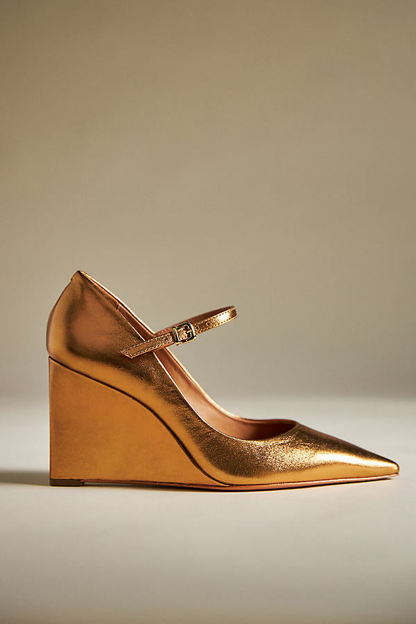 Step into effortless radiance with the Aurora Wedge by Vicenza. Crafted in a striking metallic gold finish, this wedge blends timeless elegance with modern comfort. The pointed toe elongates the silhouette, while the delicate Mary Jane strap adds a refined, feminine touch. Elevated by a sculptural wedge heel, it offers both stability and style, perfect for occasions where sophistication and comfort must coexist. Pair it with sleek tailoring or evening wear for a bold, luminous statement.