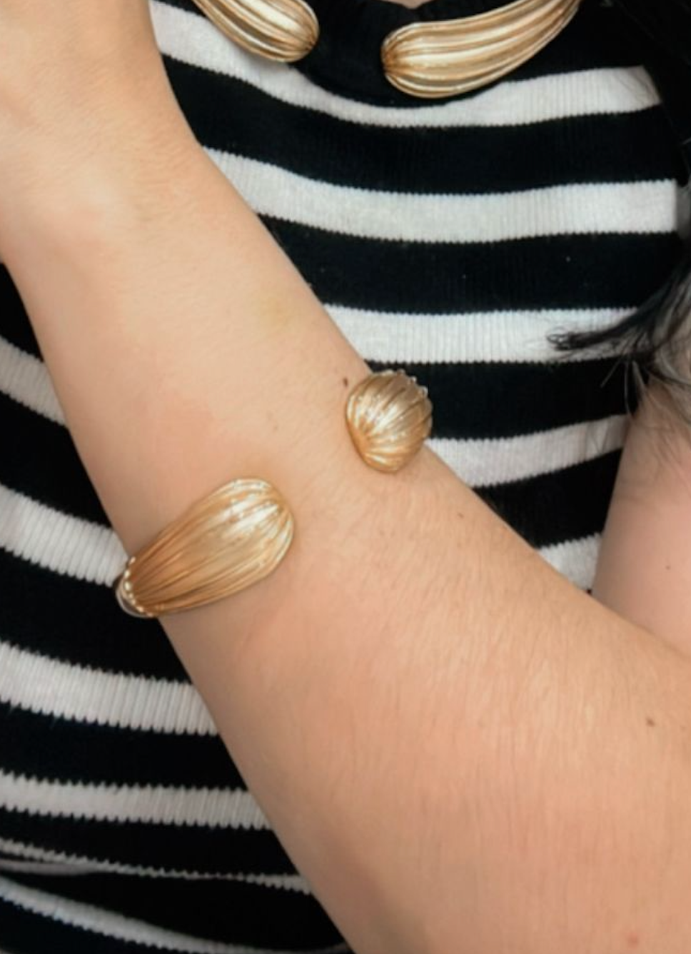 - Sculptural open cuff design