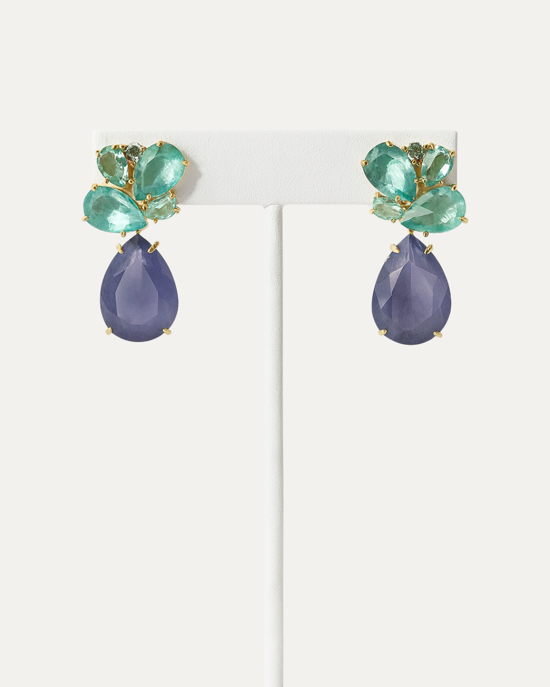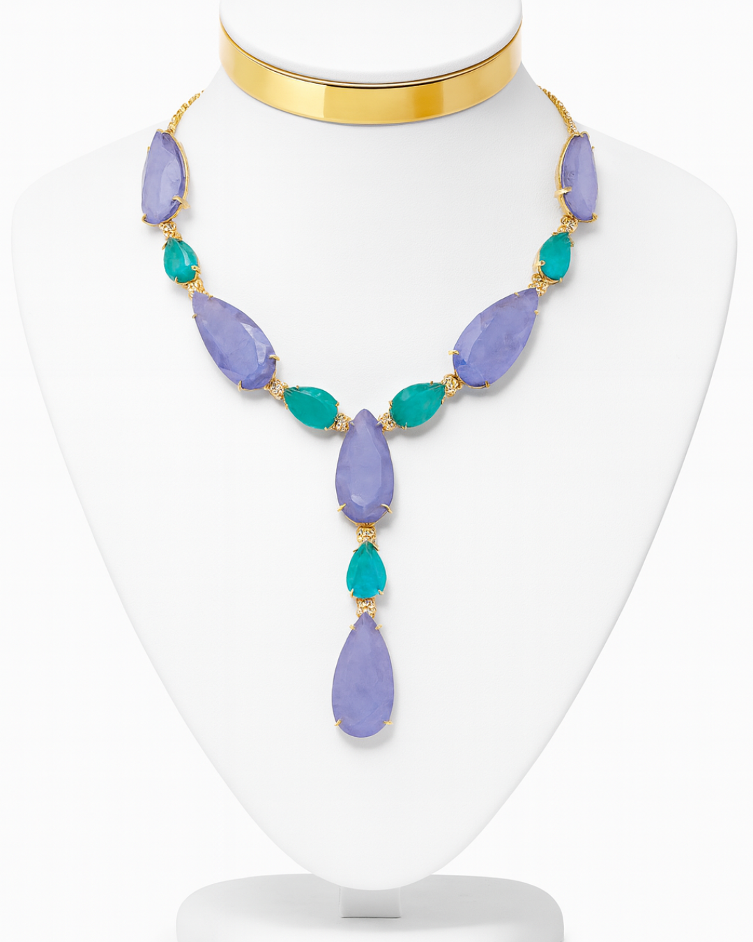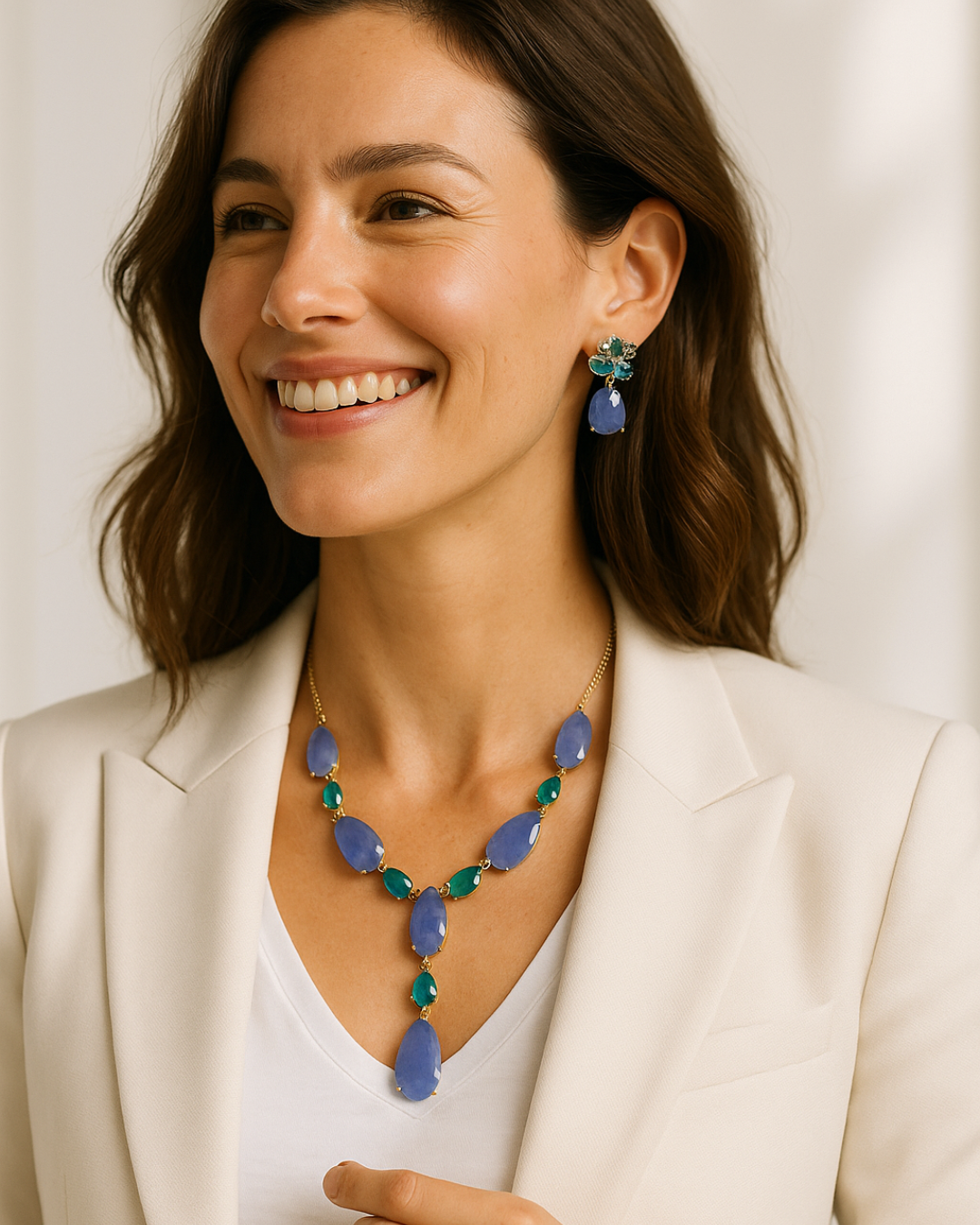 Part of the Eterna Collection, the Azurea Set captures the serenity of sky and sea through its natural blue chalcedony and green quartz stones, delicately set in 18k gold plating. The elongated drop design of the necklace adds graceful movement, while the earrings echo the same balance of color and light.