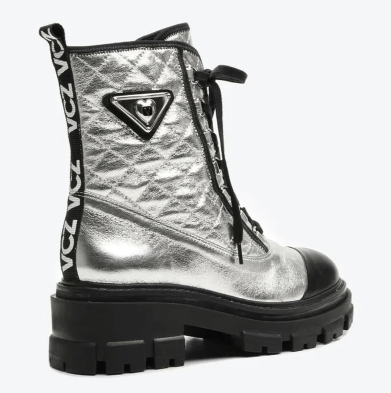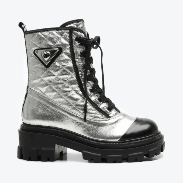The Broadway Boot by Vicenza turns everyday style into a statement. Crafted in metallic silver leather with quilted stitching, this combat-inspired design features a chunky sole, black contrast details, and the brand’s signature heart emblem. Combining edge and comfort, it brings instant attitude to any look, from casual denim to sleek nightwear.