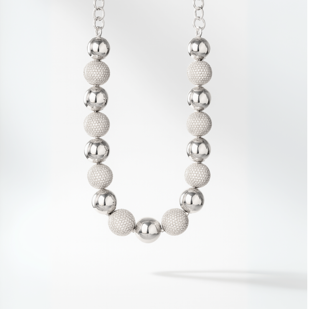 A statement of brilliance and modern design, the Bruna Necklace alternates polished rhodium-plated spheres with pavé-set zirconia orbs, each stone set by hand for impeccable sparkle. Designed to be the centerpiece of the Bruna Collection, it pairs perfectly with the Bruna Earrings, Ring, or both to create a complete look. Sold separately.