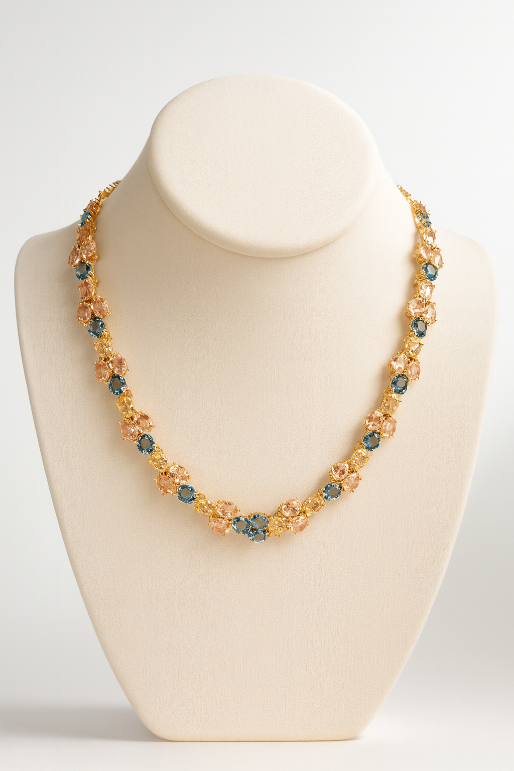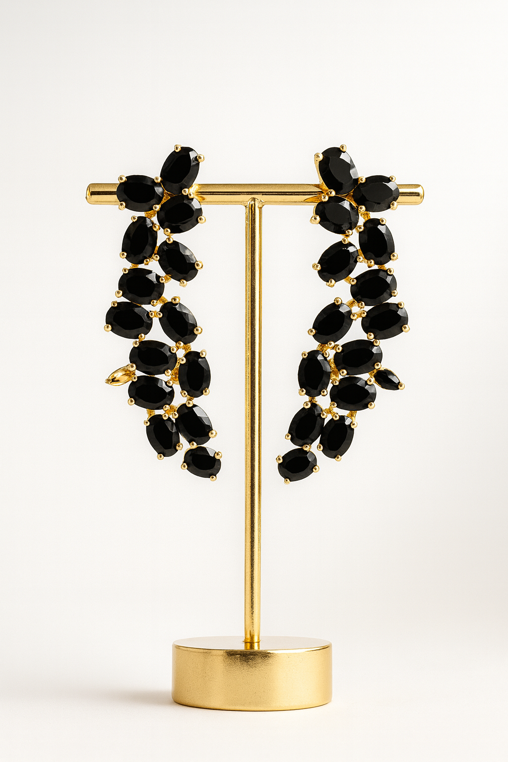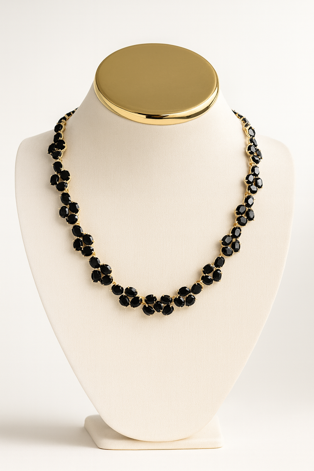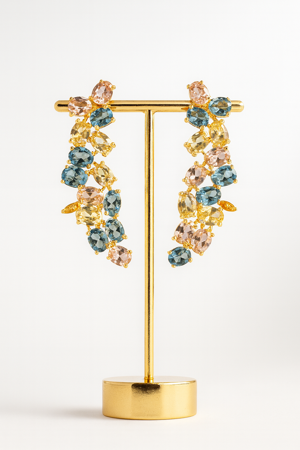 Crafted with natural Brazilian stones, the Cascade Set brings a refined balance of color, structure, and light. The necklace features a fluid composition of hand-cut stones that frame the neckline with quiet sophistication, while the matching earrings create an elegant, lifted silhouette. In Fusion, the mix of blue, yellow, and soft pink offers a luminous, modern contrast. In Onyx, the deep black stones introduce a striking and polished presence. Designed in Brazil and finished with Herreira’s signature precision, this set transitions seamlessly from elevated daytime style to evening occasions.