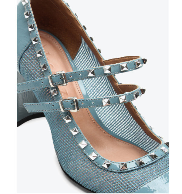 The Celestia Pump by Vicenza redefines a classic silhouette with bold sophistication. Crafted in glossy powder-blue patent leather and mesh, this statement design features double straps adorned with metallic studs, a balance of delicacy and attitude.