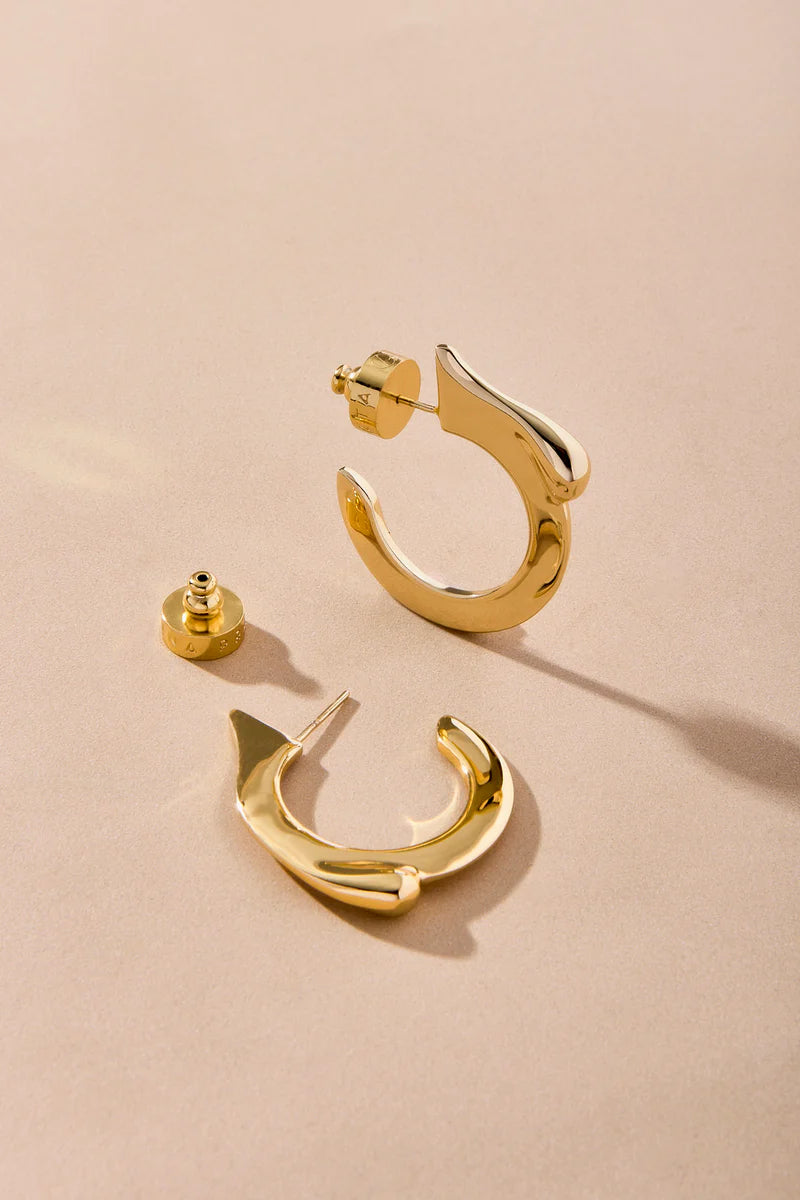 A modern twist on a timeless silhouette, the Escorrente Hoop by Anna Prata embodies the fluid, organic essence of the Brumma Collection. Handcrafted in Brazil, its sculptural curves and polished finish evoke the elegance of flowing metal, creating a refined yet striking presence. Available in 18k gold or rhodium plating, these lightweight hoops bring effortless sophistication to everyday or evening wear.