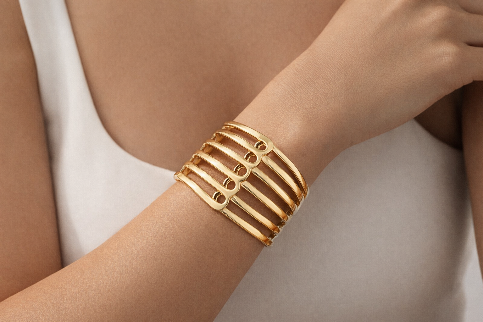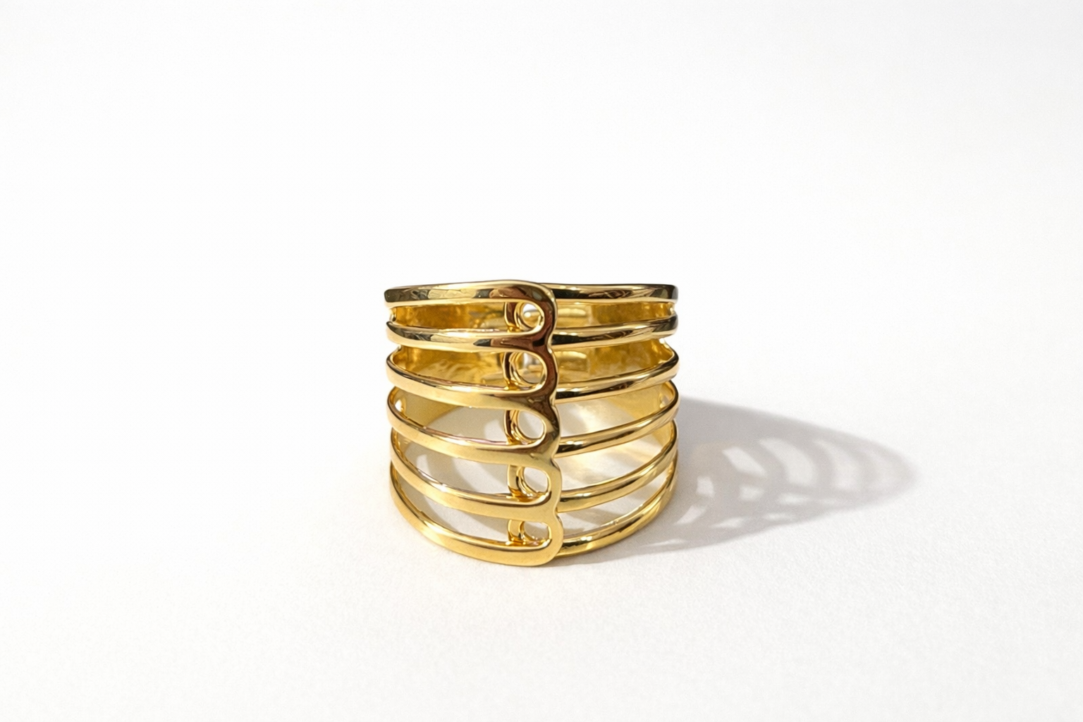 The Interlace Cuff Bracelet by Rosana Bernardes is a sculptural statement defined by rhythm, structure, and fluidity. Crafted in high-polish gold-tone metal, its layered openwork bands create a striking architectural silhouette that feels bold yet refined on the wrist. The design balances strength and elegance, with smooth curves that wrap comfortably while maintaining visual impact. Worn alone, it commands attention; paired with minimalist pieces, it elevates the entire look with modern Brazilian sophistication.