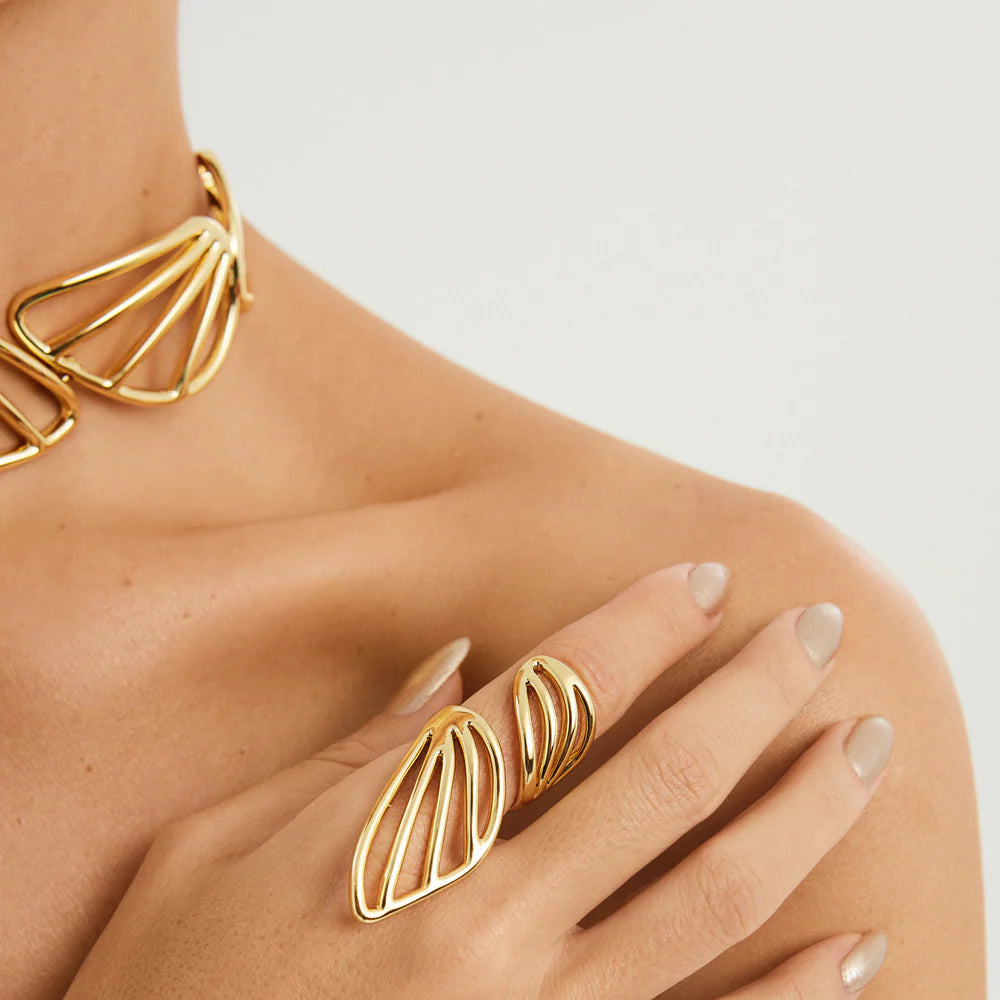 Sculptural and ethereal, the Iris Ring brings elegance with an edge. Part of the Eterea Collection by Anna Prata, this adjustable piece is available in gold or silver and features organic, wing-inspired lines that wrap delicately around the finger. Pair it with the matching Iris Earrings and Necklace for a striking, contemporary look that feels both artistic and effortless.