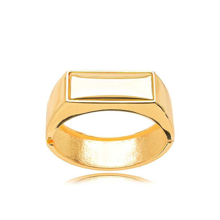 Sleek and contemporary, the Izzy Bracelet makes a bold statement with its structured silhouette and polished gold finish. Featuring a clean rectangular face and a smooth hinged opening, this piece blends geometric sophistication with modern edge. Designed for effortless wear, Izzy elevates any look with its minimalist charm and strong presence.