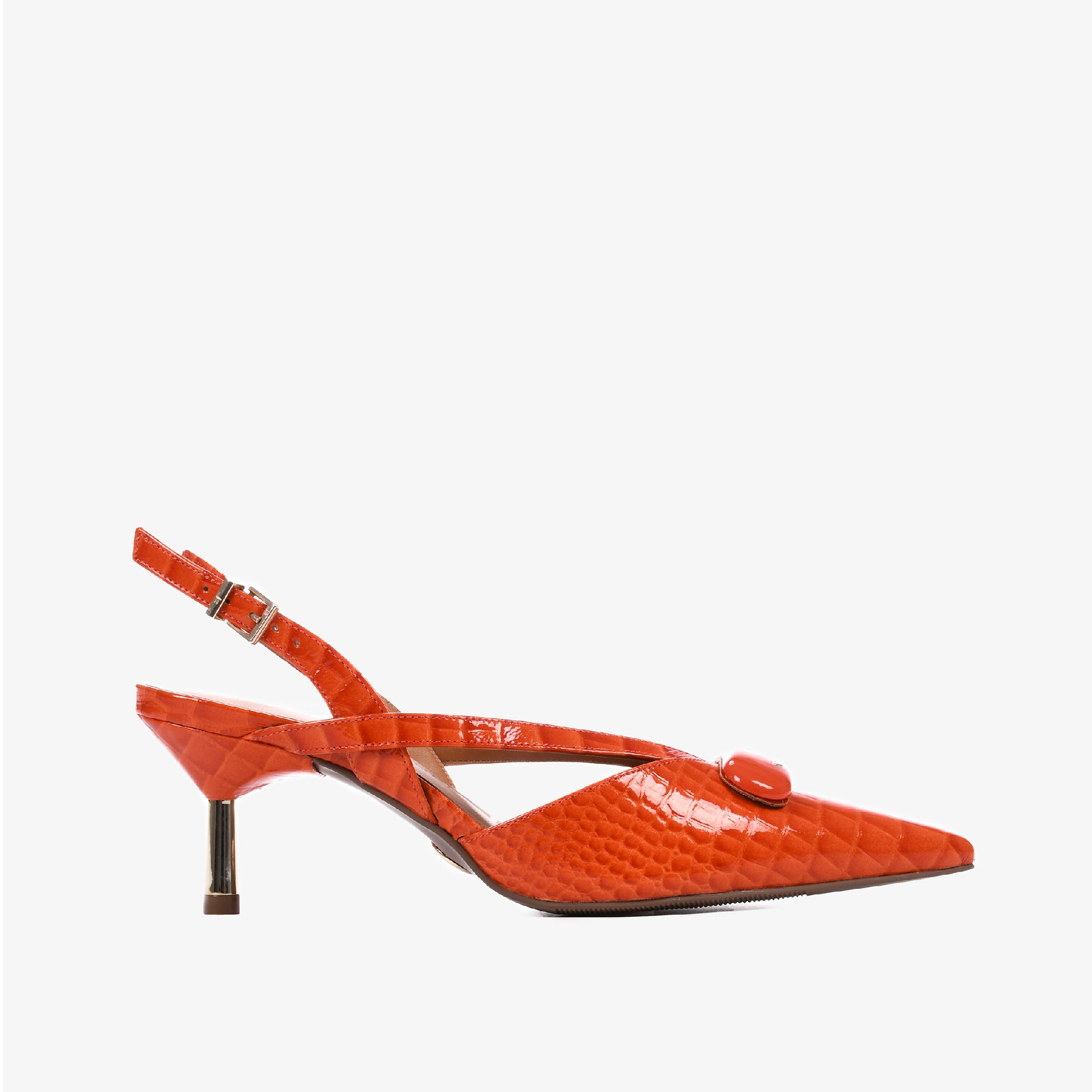 Turn up the heat. The Croco Fly Tangerine Slingback by Jorge Bischoff combines the boldness of croc-embossed leather with sleek slingback elegance. Handcrafted in Brazil, this striking heel features a pointed toe, a sculptural golden heel, and the iconic JB emblem in enamel for a polished finish. Its crossover straps and vibrant orange hue make it a statement piece that’s equal parts edgy and refined.