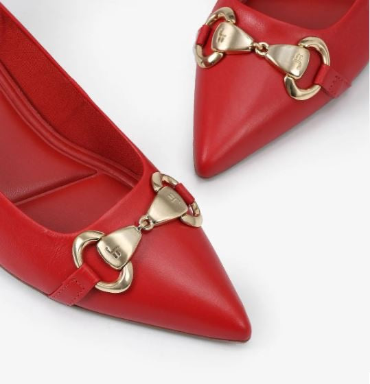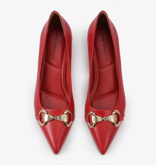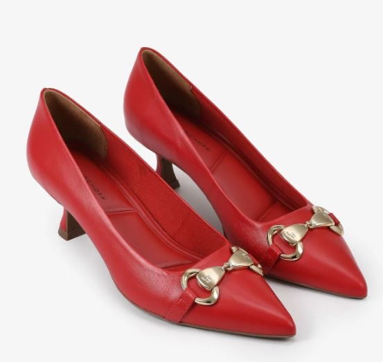 Timeless elegance with a bold touch. The Napa New Pump in vibrant red leather is designed with a refined kitten heel and a pointed toe for a sleek silhouette. The standout detail is its gold bit hardware on the front, adding sophistication and a hint of luxury. Perfect for both professional and evening settings, this pump delivers comfort and elegance in every step.