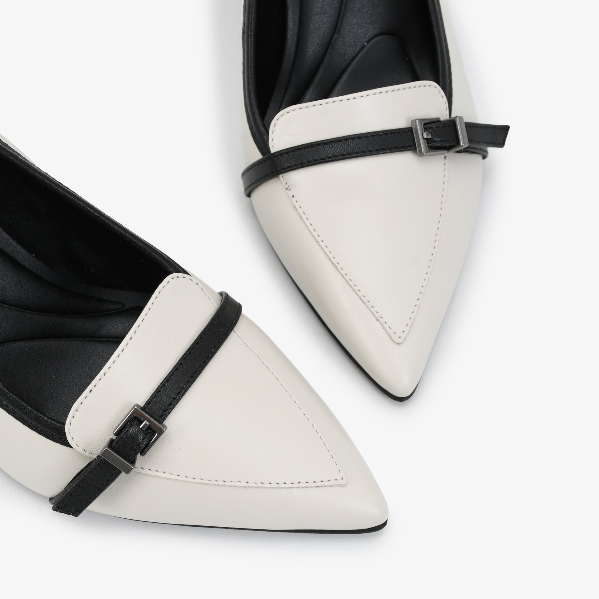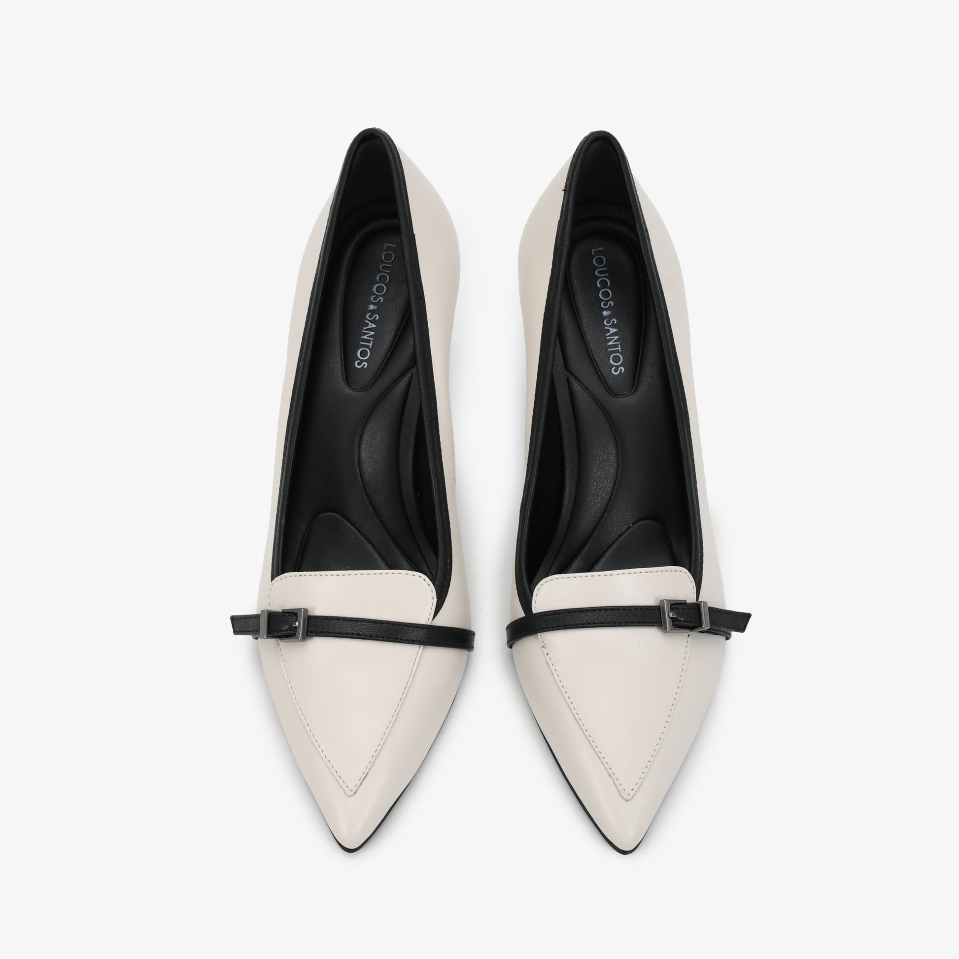 Step into understated elegance with the Napa Slim Buckle Pump by Loucos & Santos. This sophisticated pointed-toe heel blends classic design with modern minimalism, featuring a sleek off-white napa finish contrasted by black piping and a delicate front buckle strap. The mid-height stiletto heel offers both elevation and all-day comfort, making it a refined choice for workwear or special occasions. A timeless silhouette reimagined for today’s effortlessly chic woman.