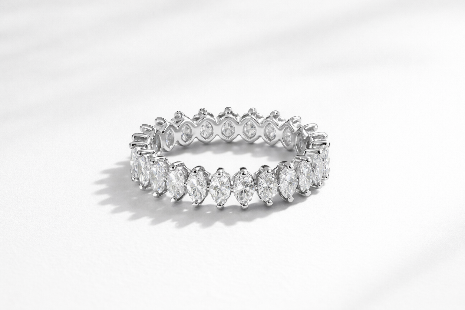 A continuous line of light, the Meridian Ring captures the refined brilliance that defines the Lumera Collection. Crafted with precision-set marquise-cut moissanite stones, each 6mm, 0.3ct stone in D color delivers exceptional clarity and fire, certified by GRA for quality and authenticity. Available in gold or silver finishes, the design balances bold sparkle with a clean, modern silhouette that feels intentional rather than ornate. Elegant worn alone and striking when stacked, this ring is designed for women who appreciate luminosity with restraint.