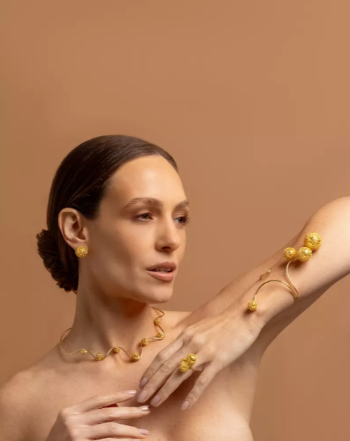Radiant in form and craftsmanship, the Lúmen Earrings by Michely Pacheco bring light to every look. Each pair is delicately handcrafted using the ancestral crochet technique with fine copper threads, then bathed in rich 18k gold for a luminous finish. Their elegant spherical silhouette offers modern simplicity with artisanal soul — a versatile piece that transitions seamlessly from day to night.
