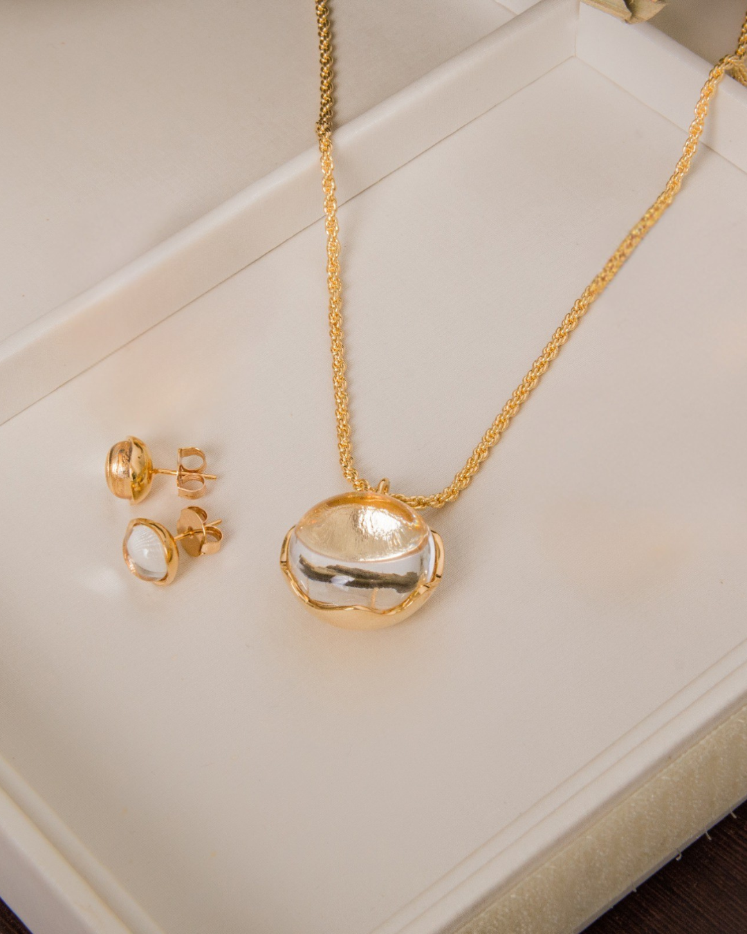 Part of Herreira’s Paty 4.6 Collection, the Lunara Set captures light and form through natural Brazilian stones, polished to a soft, luminous finish. Handcrafted in Brazil and plated in 18k gold, the necklace and earrings balance sculptural design with organic transparency, creating a refined harmony between nature and artistry. Designed to pair with the matching Lunara Ring and Lunara Bracelet, this authoral creation reflects the sophistication and authenticity that define Herreira’s craft.