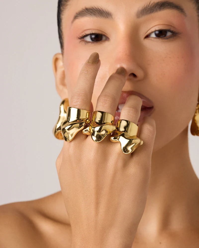 Available in both gold and silver plating, this ring adapts easily to any occasion, from elevated everyday looks to artistic evening wear.