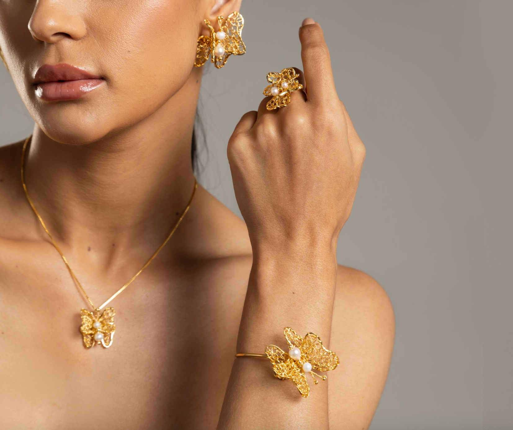 The butterfly, the central symbol of this collection, represents transformation, beauty, and freedom, values that resonate deeply with the essence of the brand. Every piece is a testament to the artistry and skill involved in crochet jewelry, where threads are carefully woven to form striking patterns that enhance the beauty of the gold plating.