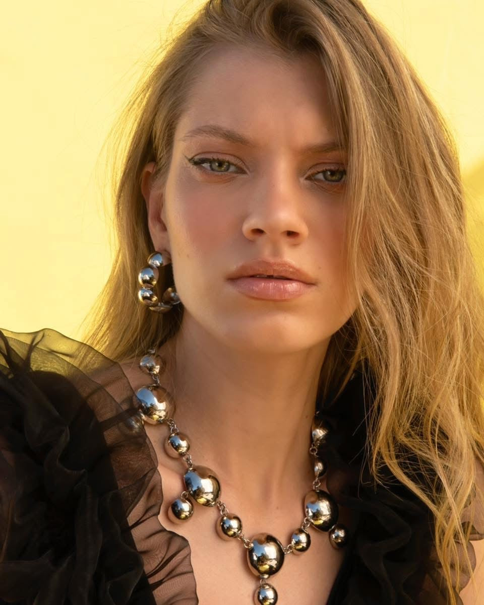 Bold and luminous, the Esfera Set by Rosana Bernardes is a sculptural expression of elegance and modern design. With high-shine metallic spheres that reflect light from every angle, this necklace and matching hoop earrings create a powerful visual rhythm, both playful and sophisticated.