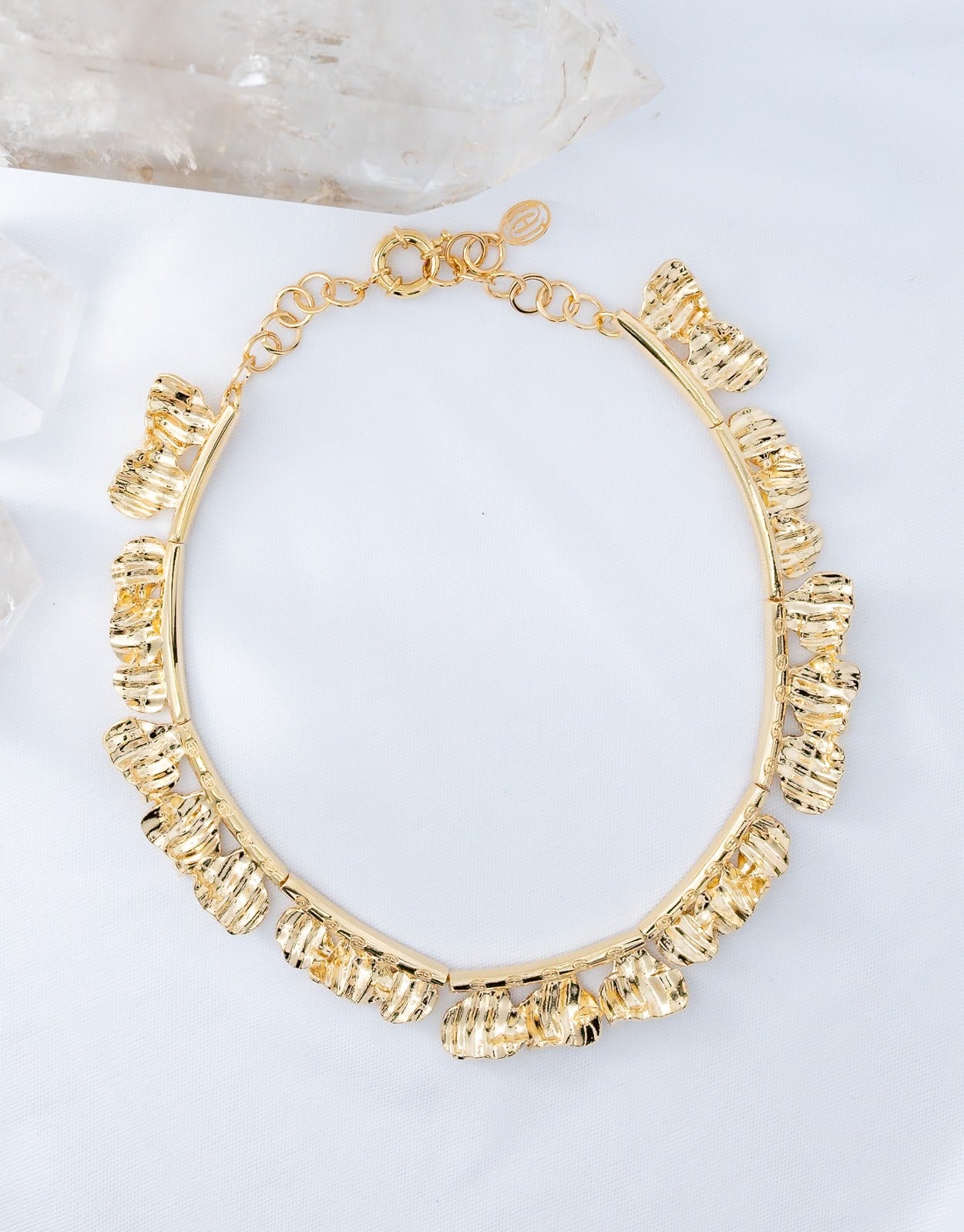 Part of Herreira’s Paty 4.6 Collection, the Valenne Set embodies sculptural elegance and radiant movement. Handcrafted in Brazil and plated in 18k gold, the necklace features a sequence of textured golden forms that shimmer with fluid light, paired with bold earrings that echo the same luminous design. Refined yet expressive, this authoral creation captures the sophistication and artistry that define Herreira’s Brazilian craftsmanship.
