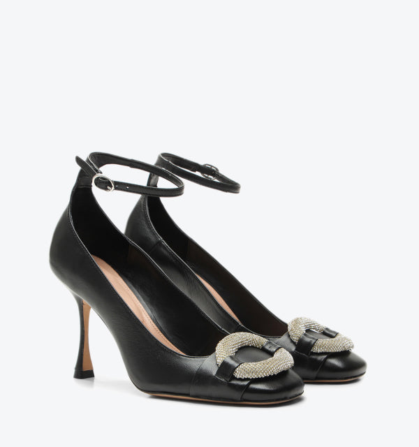 Step into timeless elegance with the Midnight Grace Pump, a sophisticated design that blends classic femininity with modern allure. Crafted in sleek black leather, this pointed-toe pump features an ankle strap for refined support and a sparkling crystal-embellished buckle detail that commands attention. Set on a slender stiletto heel, it’s the perfect statement shoe for evening occasions, cocktail events, or adding instant glamour to tailored looks.
