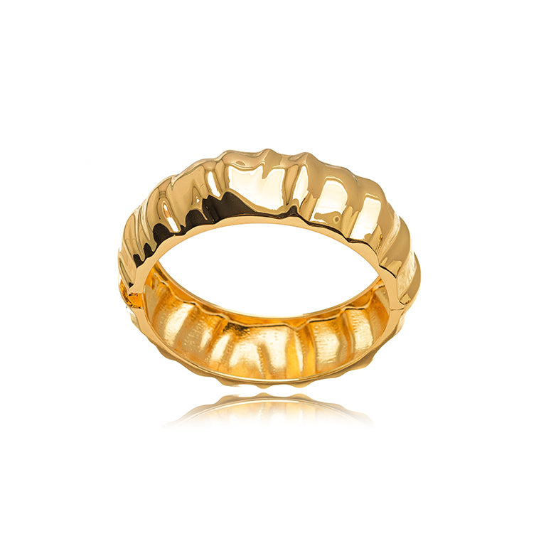 Bold and sculptural, the Yuri Bracelet commands attention with its fluid, ridged design and high-shine gold finish. Its voluminous form hugs the wrist with effortless glamour, making it the perfect statement piece for both elevated evenings and fashion-forward daywear. Wear it solo to let it shine or stack it for amplified impact.